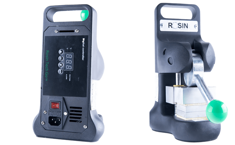 The second press on the list is Rosin Tech’s Go 2, the updated version of the original Go model, that can generate up to 700 lb of pressure and features 2 by 2.25 inch heating plates. The press has an interesting mechanical solution for closing the plates by rotating a steel cylinder with an off center axis.